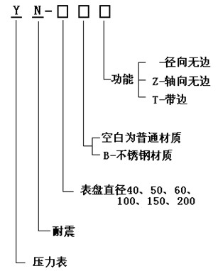 选型说明:功能选型中“T”仅适用于Φ60 Φ100 Φ150表盘的压力表